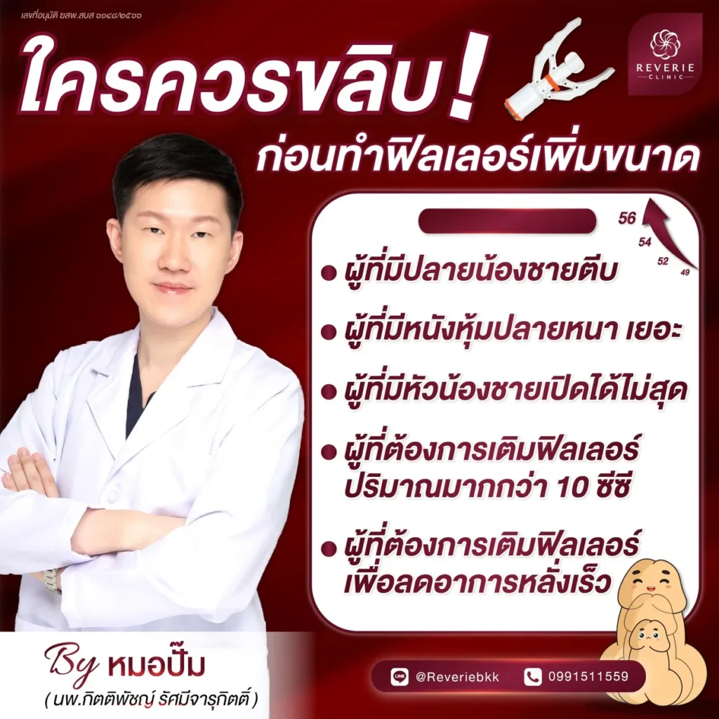 แต่ถ้าใครกังวลเรื่องผลข้างเคียง ไม่อยากให้ฟิลเลอร์เพิ่มขนาดไหลไปกองตรงปลาย และต้องการเพิ่มขนาดเยอะ ๆ โดยเฉพาะต้องเติมตรงส่วนหัวหลายซีซี หมอปั๊ม เพิ่มขนาด แห่ง Reverie Clinic แนะนำให้ไปขลิบน้องชายให้เรียบร้อยก่อน เพื่อเพิ่มขนาดน้องชายอย่างปลอดภัย ไม่มีปัญหากวนใจตามมานะครับ หากใครยังไม่มั่นใจ ลังเลจะขลิบดีหรือไม่ หมอปั๊ม เพิ่มขนาด ยินดีให้คำปรึกษาครับ
